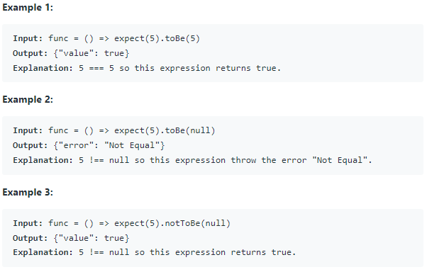 - toBe(val) accepts another value and returns true if the two values === each other. If they are not equal, it should throw an error "Not Equal".